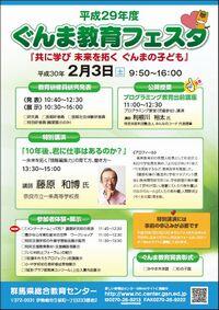| 1 テーマ 「共に学び 未来を拓く ぐんまの子ども」 2 実施日 平成30年2月3日(土) 9:50 ~ 16:00 3 会場 群馬県総合教育センター 住所:群馬県伊勢崎市今泉町1-233-2 電話:0270-26-9211(代表) FAX:0270-26-9222 4 実施概要 【オープニング・ぐんま教育賞表彰式】 ≪9:50~10:30≫ | |